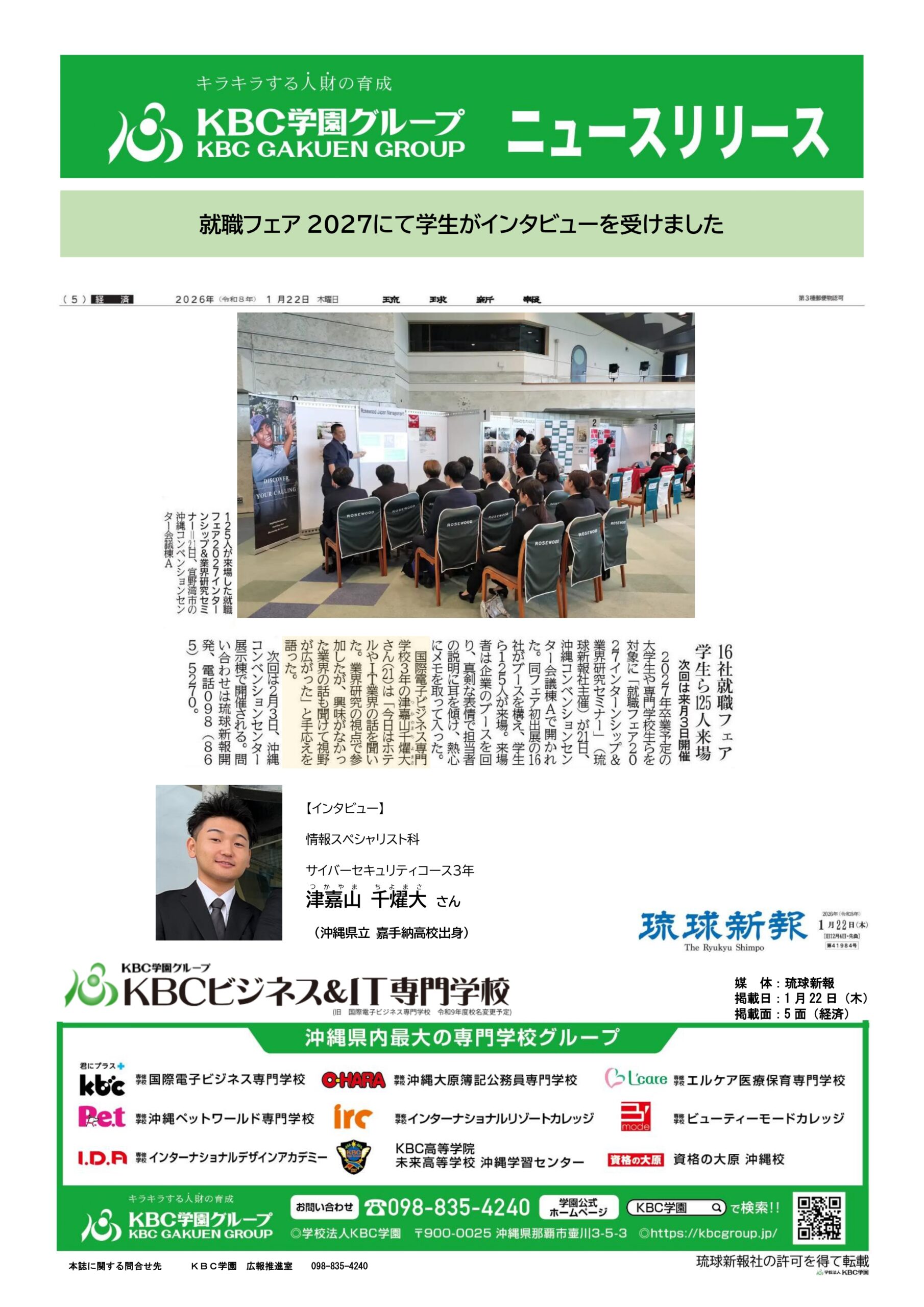 国際電子ビジネス専門学校3年の津嘉山千燿大(つかやまちよまさ)さん(21)は「今日はホテルやIT業界の話を聞いた。業界研究の視点で参加したが、興味がなかった業界の話も聞けて視野が広がった」と手応えを語った。