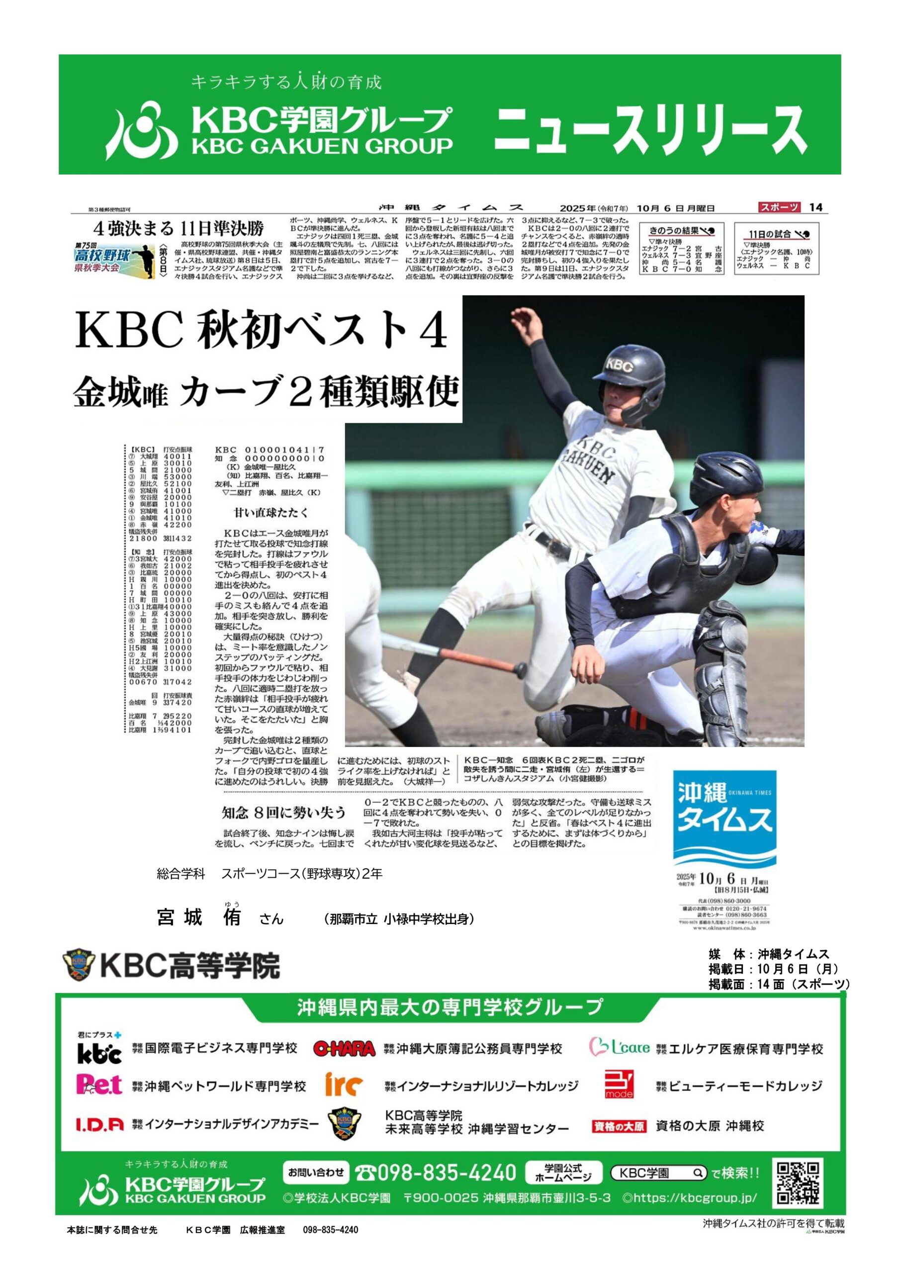 KBC 秋初ベスト4 金城 カーブ2種類駆使