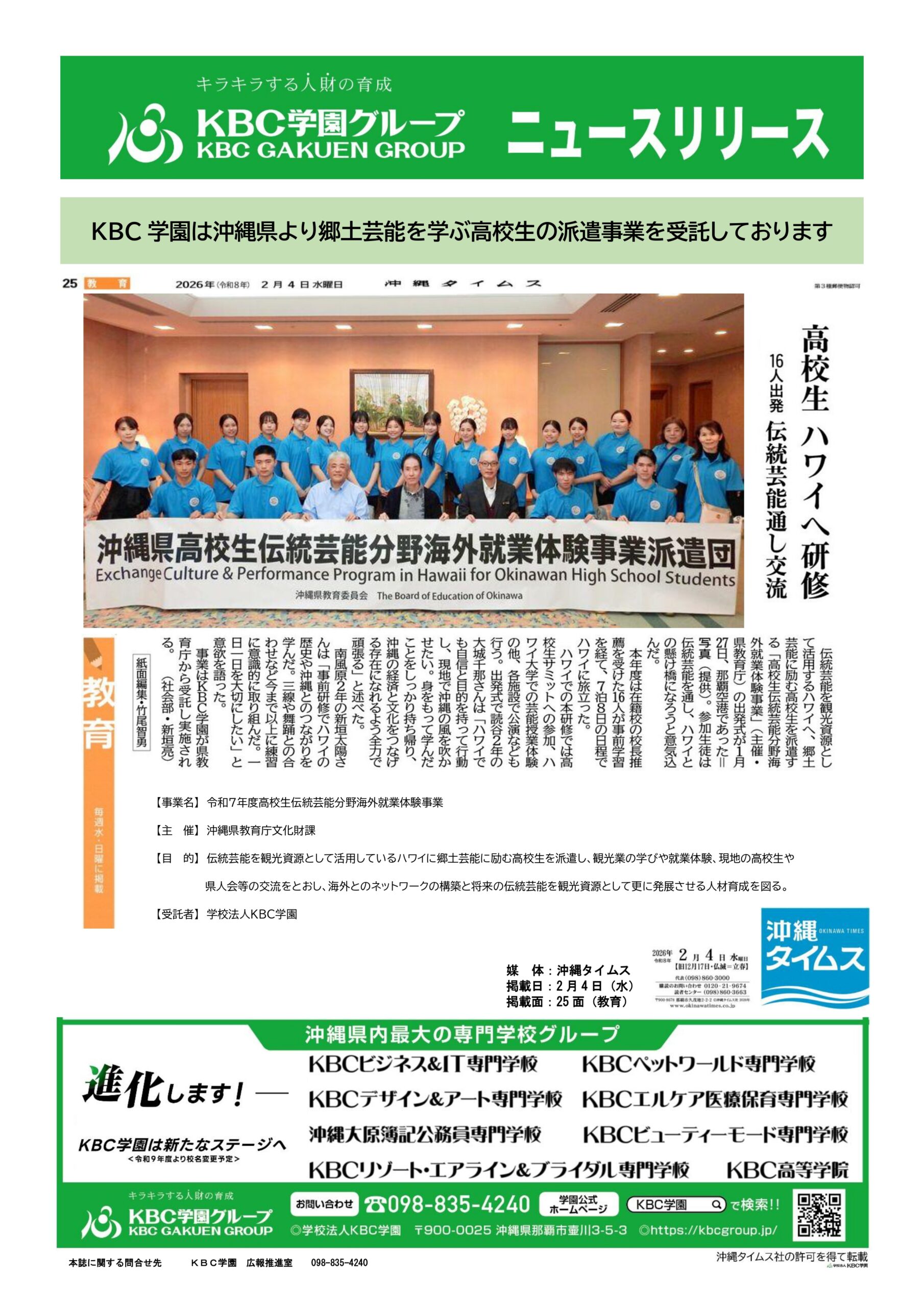 【学園情報】郷土芸能に励む高校生がハワイへ出発しました(県受託事業)